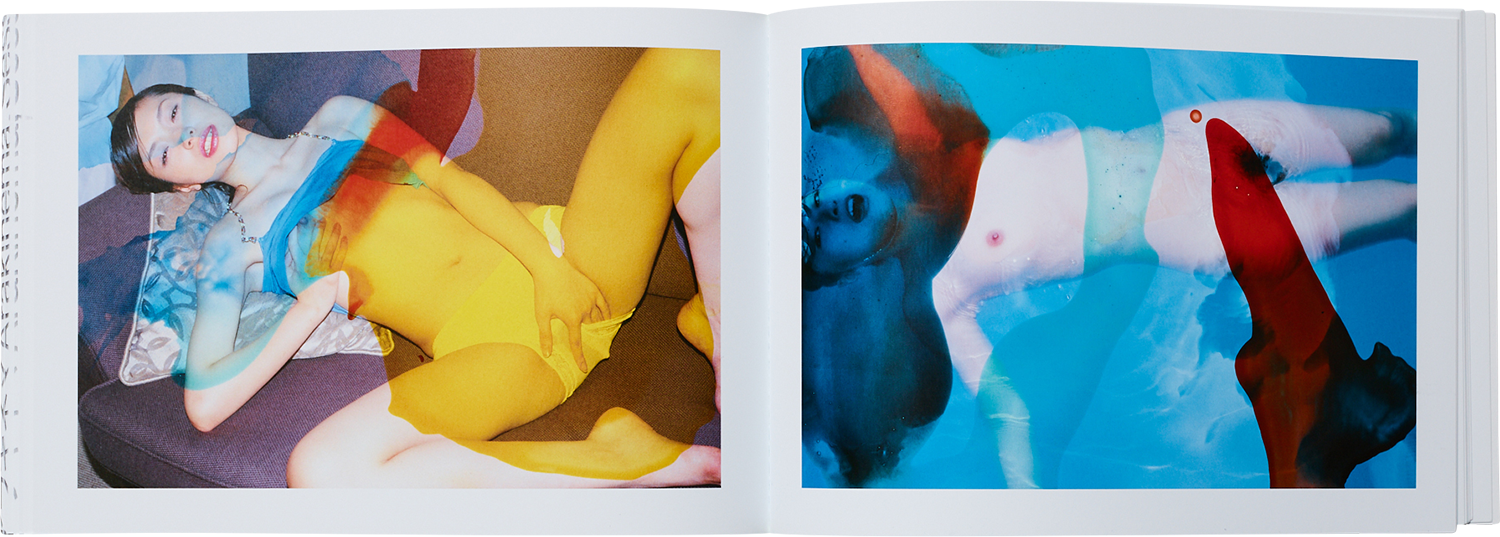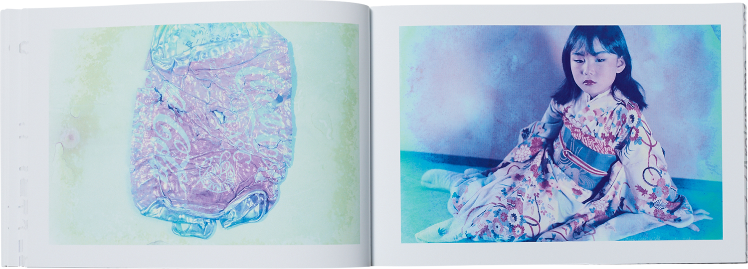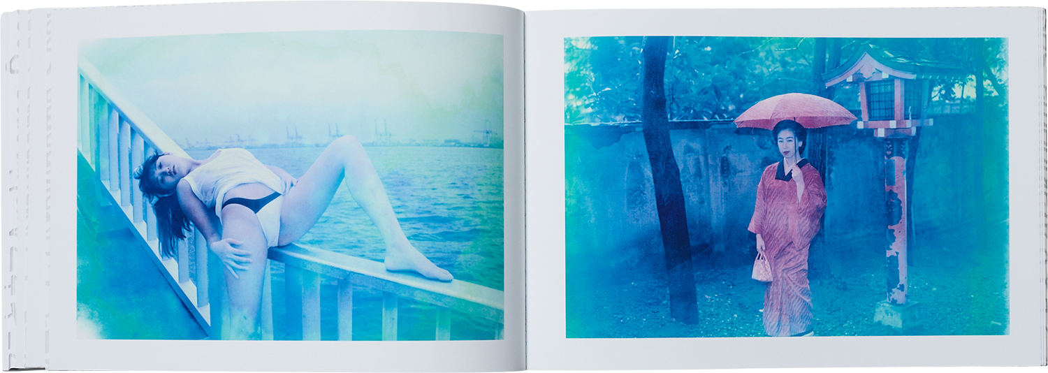 本写真集では、ライブの臨場感や雰囲気をできるだけ忠実に再現するために、両作品が上映 された際のオリジナルスライドに基づいて編集、制作しました。『青ノ時代』『去年ノ夏』はともに 2005 年に発表された作品であり、前者は 1980〜90 年代に雑誌『写真時代』に掲載された作品でまとめられている一方、後者は 2005 年前後に 撮り下ろされた作品が使用されています。 ヌードとポートレートを軸にしながら、街路の風景や花の写真なども併せて構成された両作品に共通しているのは、オリジナルの写真に手を加えることで力強い効果を生み出しているという点です。『青ノ時代』では薬品で脱 色することで引き出された色褪せたブルーが、まるで夢か消え去っていく記憶の中にでもいるかのような、メラン コリックな儚さを作品にもたらしています。また『去年ノ夏』は明るく透明感のある色を写真の上に塗っていくこと で、まるで万華鏡が映し出す幻想的な世界を表現しています。
